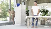 A kinky mistress forcing her slave to lick and bust nuts