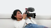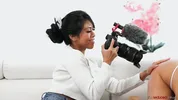 Ember Snow, the busty Asian beauty, gives a fan a lap dance and more.