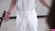 The girl is doing her exercises when a guy comes in