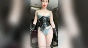 The femdom goddess wears a black latex catsuit, gloves, and corset to dominate.