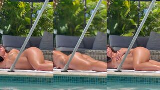 Miss Raquel gets sand from her hot body in a steamy post-beach scene.