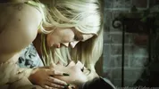 Two beautiful blondies, Jazlyn Ray and Kay Lovely, share a huge cock.
