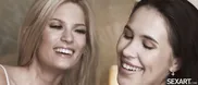 Blonde girl in lingerie has fun with girlfriend, featuring hot kissing scenes.