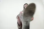 Barefoot Felicia Fisher in balloon play with Hanes