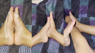 Girl rubbing lotion on her feet in a sensual way