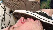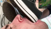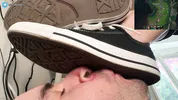 Kally smells and licks stinky pantyhose, indulging in foot fetish with Goddess Grazi.