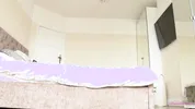 Girl makes a coffee and sucks and fucks a big dildo.