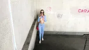 A chubby girl with a goth look named Emma Celeste has an urgent need to pee outdoors.