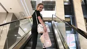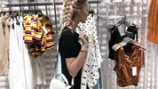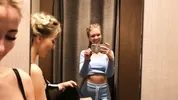 Happy Yulia is trying on different outfits in the fitting room, teasing and playing around.