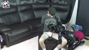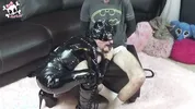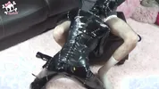 A crossdresser is being fucked by a dominant lesbian with a strapon.