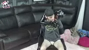 Whitney Morgan is tied up and gagged, wearing only Adidas slides. She struggles hard.
