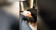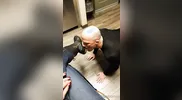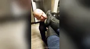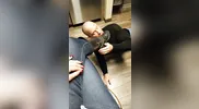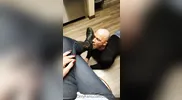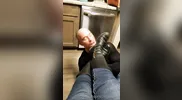 The guy smells feet after removing his shoes and taking off my socks