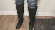 A gum and boot fetish with a hot jean shorts wearing brunette