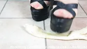 Foot worship and cum on high heel mules with Dame Olga