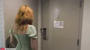A girl in a red dress is touching herself