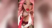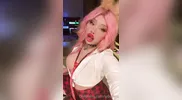Pink-haired Angel Long, the tall and leggy British stunner, gives a thumbs up with...