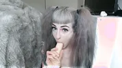 Girl sucks and gags on a big dildo, showcasing her skills.