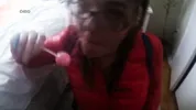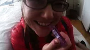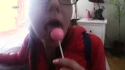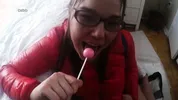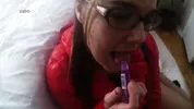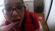 Kristy masturbates while blowing bubble gum and sucks dick with a retainer