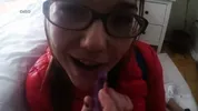 Dirtykristy in pigtails and glasses facialising cock