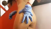 Hot brunette in black latex gloves and ass play