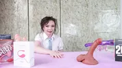 Petite schoolgirl plays with huge dillos in explicit scenes