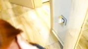 A small model is sucking cock in the bathroom, caught by surprise.