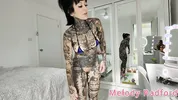 Melody Radford in shiny micro bikini trying it on.