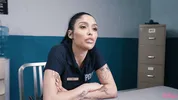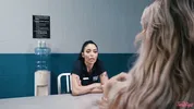 Officer Vanessa Sky spanks questionee Kayley Gunner's round butt in a steamy scene.